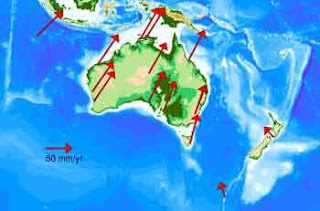 صورة لقارة أستراليا توضح كيف تتحرك هذه القارة باتجاه الشمل الشرقي، بمعدل 73 مليمتر في السنة، ويتحرك قاع البحار من حولها 50 مليمتر في السنة باتجاه الشرق. المصدرwww.ga.gov.au
