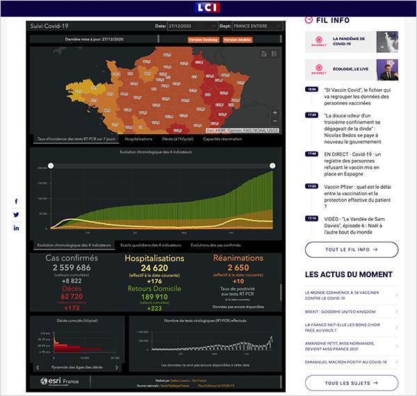 Depuis presque 10 mois, la crise sanitaire de la Covid-19 a impacté le quotidien de tous les habitants de notre planète. Dès les premiers jours de l'épidémie, la géographie s'est avérée essentielle pour évaluer, comprendre et anticiper les actions à mener pour protéger la population. Pour cette raison, chez Esri France et chez de nombreux distributeurs Esri dans le monde, nous avons réalisé ou aidé nos utilisateurs à réaliser des applications de suivi de la pandémie. En France, notre tableau de bord est devenu une référence pour de nombreuses organisations mais aussi pour le grand-public.