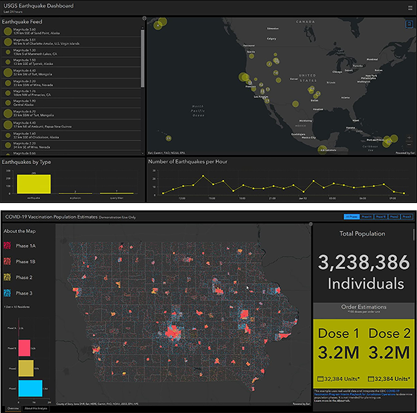 L'an dernier, le nombre de tableaux de bord ArcGIS qui ont été créés et partagés publiquement (ou en privé) a littéralement explosé (plusieurs milliers par jours). Leur utilisation touche de nombreuses thématique mais pour 2020 on notera en particulier la santé publique, la gestion des urgences, le suivi des interventions en situation de crise et la sécurité publique durant les événements publics. On l'aura bien compris avec le suivi géographique de la propagation du Covid19, la distribution locale des masques de protection ou encore aujourd'hui avec le suivi de la campagne de vaccination, les tableaux de bord changent la façon dont nous visualisons et explorons des informations qui sont mises à jour en temps réel par une communauté ou une autorité. Ils rendent la consommation et compréhension des données rapide et accessible à tous.