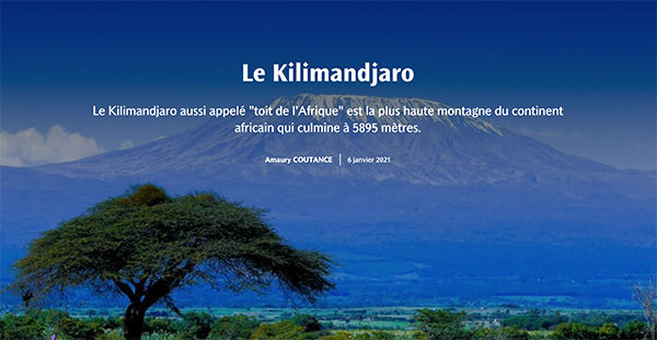 Cette semaine, je vous propose de partir sur le continent africain, en Tanzanie, et plus particulièrement sur le "toit de l'Afrique". En effet, la Story Map que j'ai retenu cette semaine concerne Le Kilimandjaro est la plus haute montagne du continent africain et culmine à 5895 mètres.